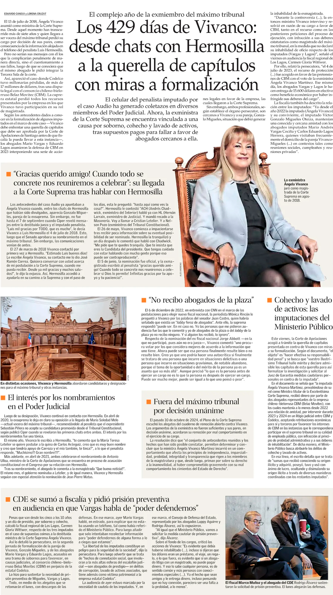 Exsuprema Vivanco habría recibido US$ 15.600 en oficina de abogado el mismo día que falló a favor de empresa chilena-bielorrusa, según fiscalía - (El Mercurio de Santiago)
