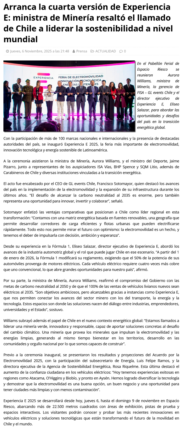 Comienza Experiencia E 2025: ministra Aurora Williams destaca el liderazgo de Chile en sostenibilidad y minería verde - (mineriayfuturo.cl)
