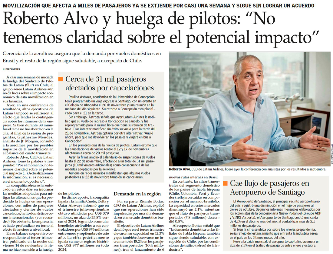 DT intensifica gestiones por huelga de Latam y aerolínea cancela vuelos hasta el 22 de noviembre - (Diario Financiero)