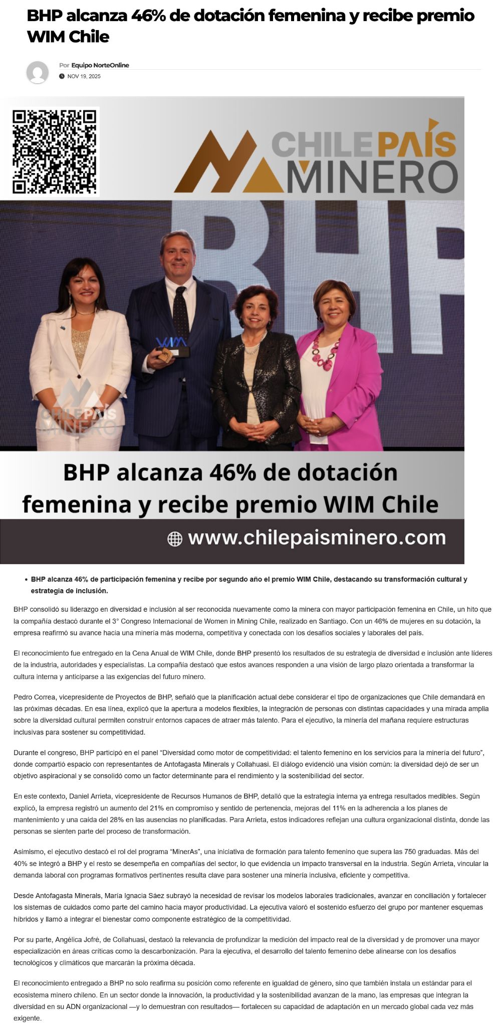 BHP la minera con mayor participación femenina en sus operaciones con el 46% - (revistacrisol.cl)