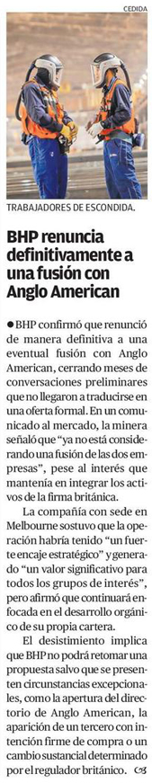 BHP renuncia definitivamente a una fusión con Anglo American - (El Mercurio de Calama)