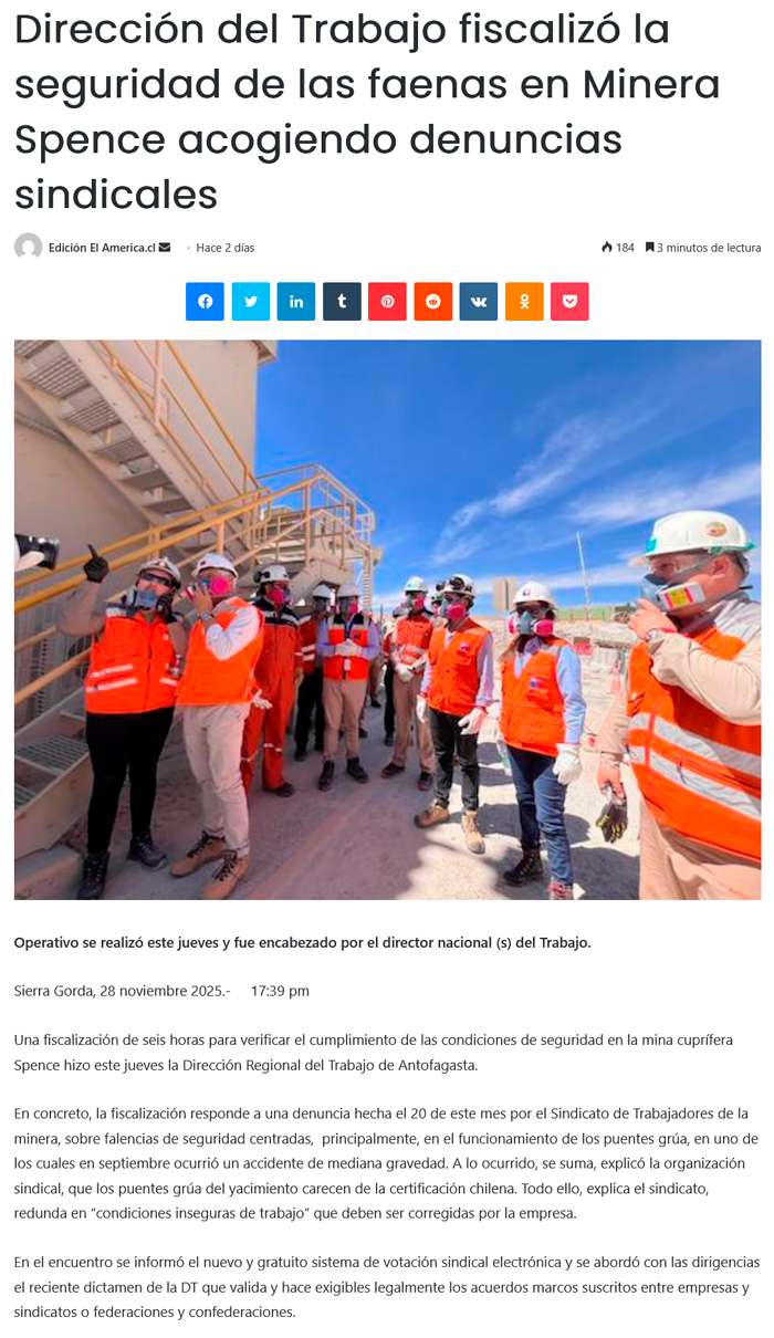 Dirección del Trabajo fiscalizó la seguridad de las faenas en Minera Spence acogiendo denuncias sindicales - (desiertofm.cl)