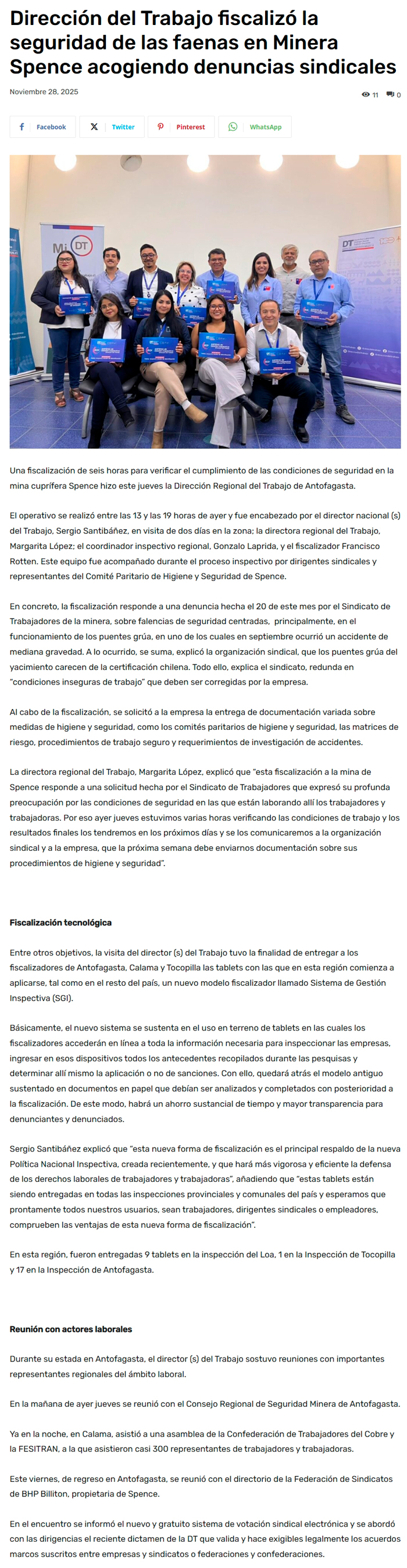 Dirección del Trabajo fiscalizó la seguridad de las faenas en Minera Spence acogiendo denuncias sindicales - (elamerica)