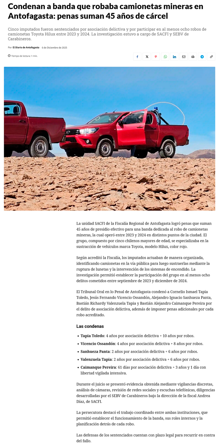 Antofagasta: duras condenas por robos de camionetas - (El Mercurio de Santiago)