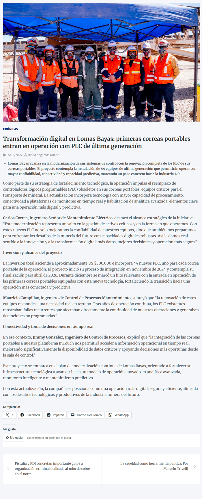 Lomas Bayas inició modernización de sus correas portables con nuevo sistema de control PLC - (electromineria.cl)