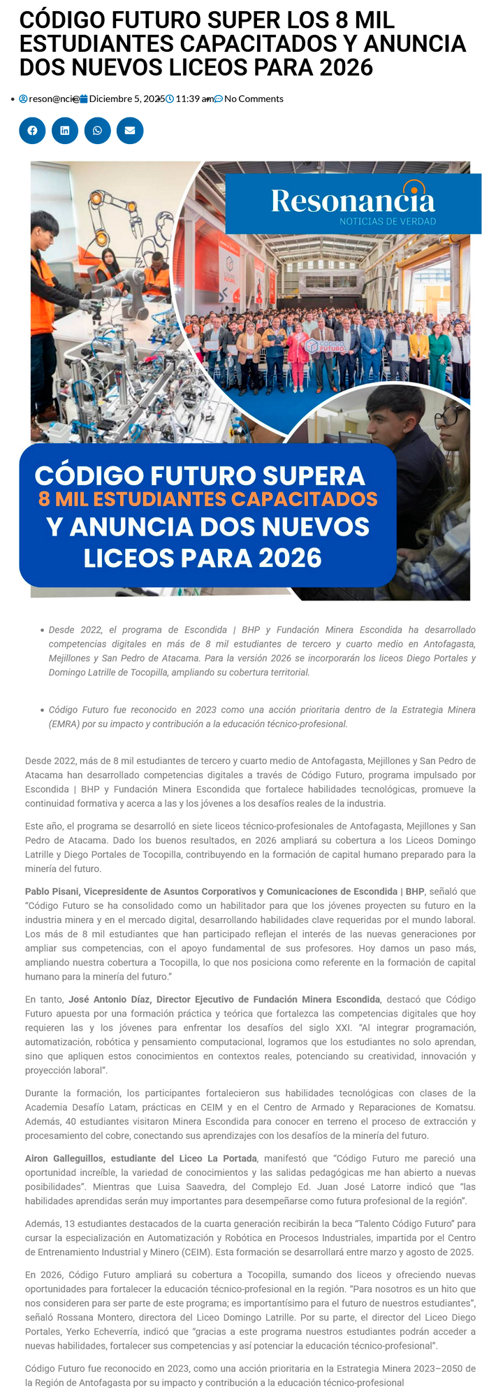 Código Futuro supera los 8 mil estudiantes capacitados y anuncia dos nuevos liceos para 2026 - (El Mercurio de Antofagasta)