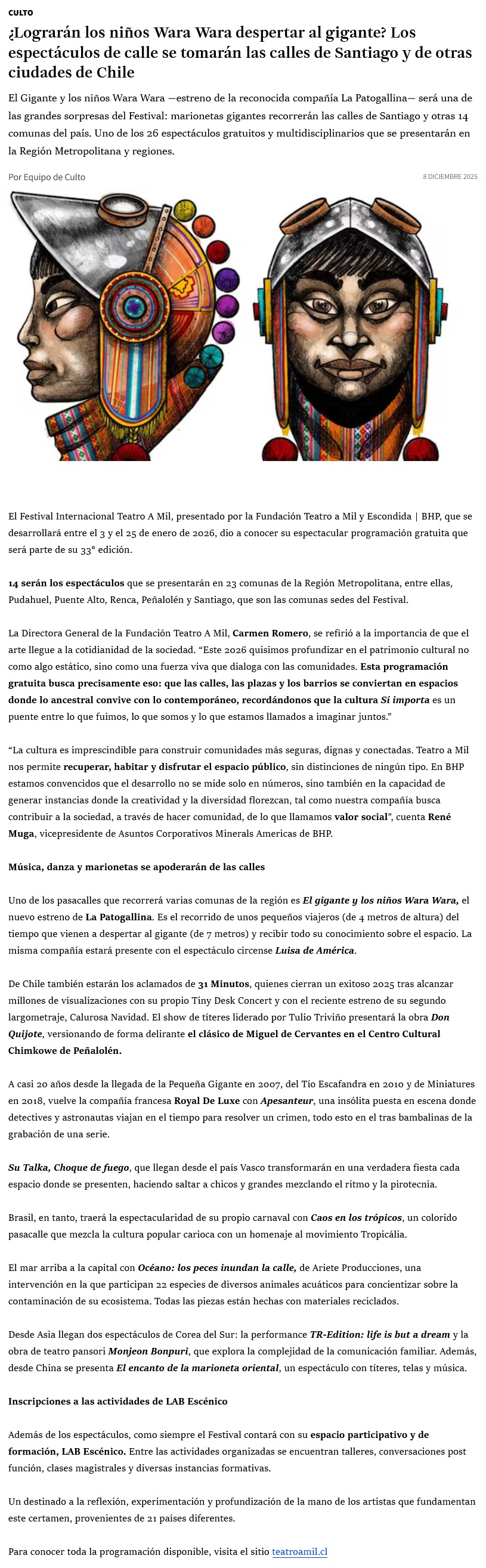 ¿Lograrán los niños Wara Wara despertar al gigante? Los espectáculos de calle se tomarán las calles de Santiago y de otras ciudades de Chile - (g5noticias.cl)