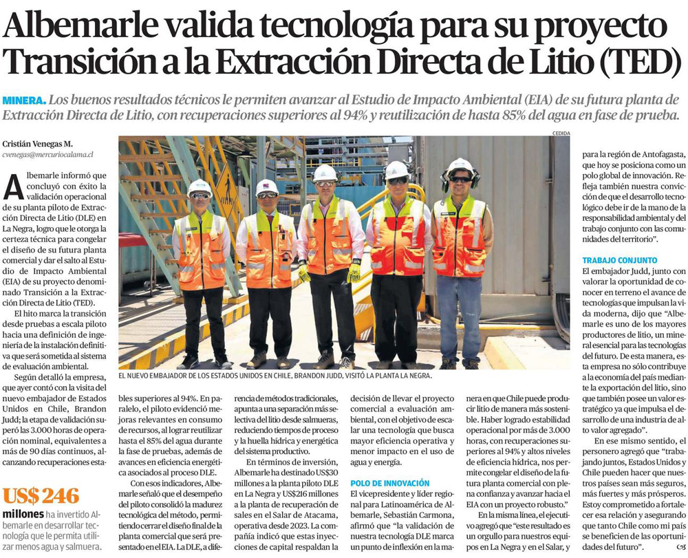 Albemarle define el diseño de su planta de extracción directa de litio y prepara ingreso de permiso ambiental - (Pulso)
