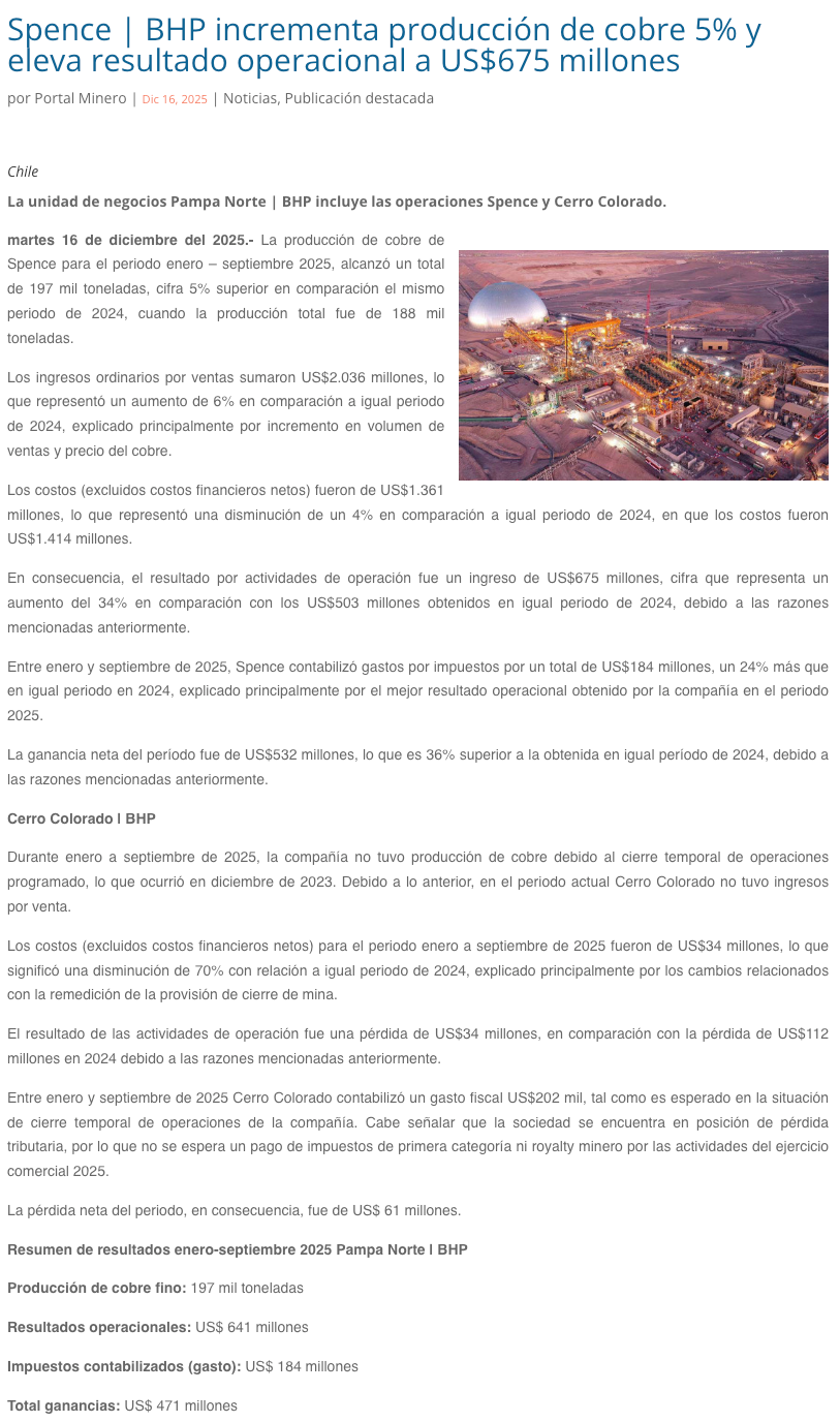 BHP Spence: producción de cobre crece en 2025 con menor costo y mejores resultados operacionales - (nuevaminería online)