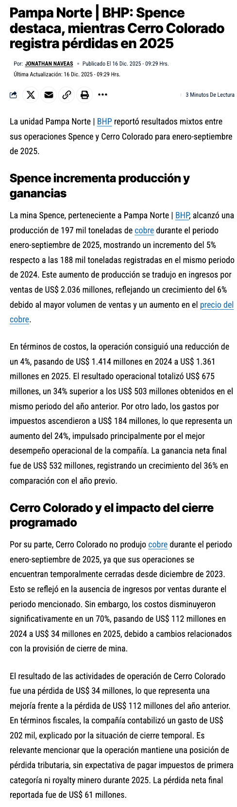 BHP Spence: producción de cobre crece en 2025 con menor costo y mejores resultados operacionales - (nuevaminería online)