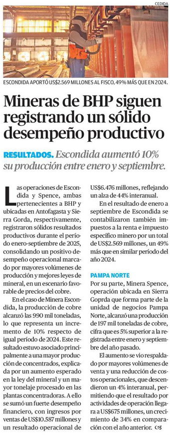 Mineras de BHP siguen registrando un sólido desempeño productivo - (El Mercurio de Calama)