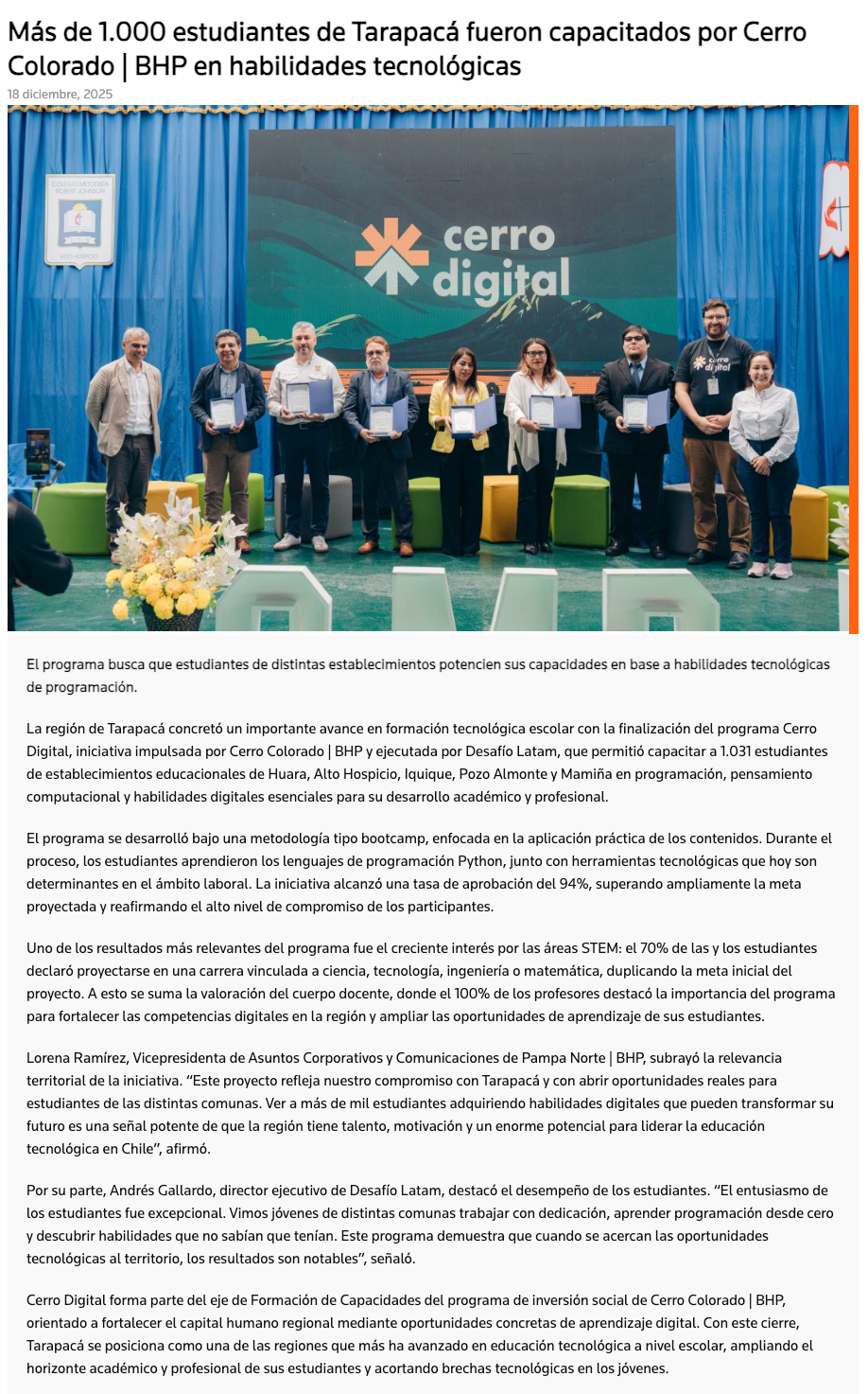 Más de 1.000 estudiantes de Tarapacá fueron capacitados por Cerro Colorado | BHP en habilidades tecnológicas - (redimin)