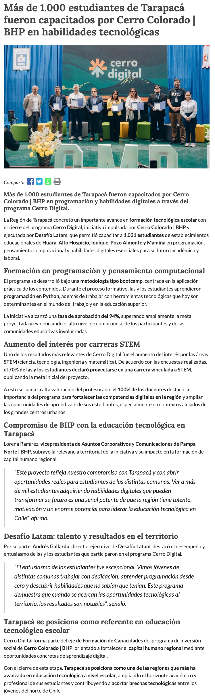 Más de 1.000 estudiantes de Tarapacá fueron capacitados por Cerro Colorado | BHP en habilidades tecnológicas claves para su futuro - (g5noticias.cl)