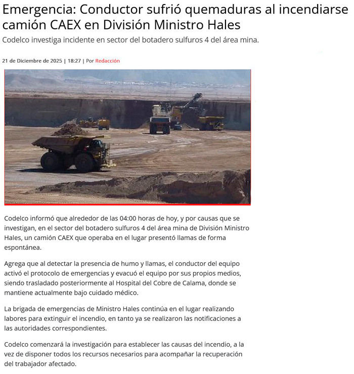 Investigan incendio de CAEX en la división Ministro Hales - (El Mercurio de Antofagasta)