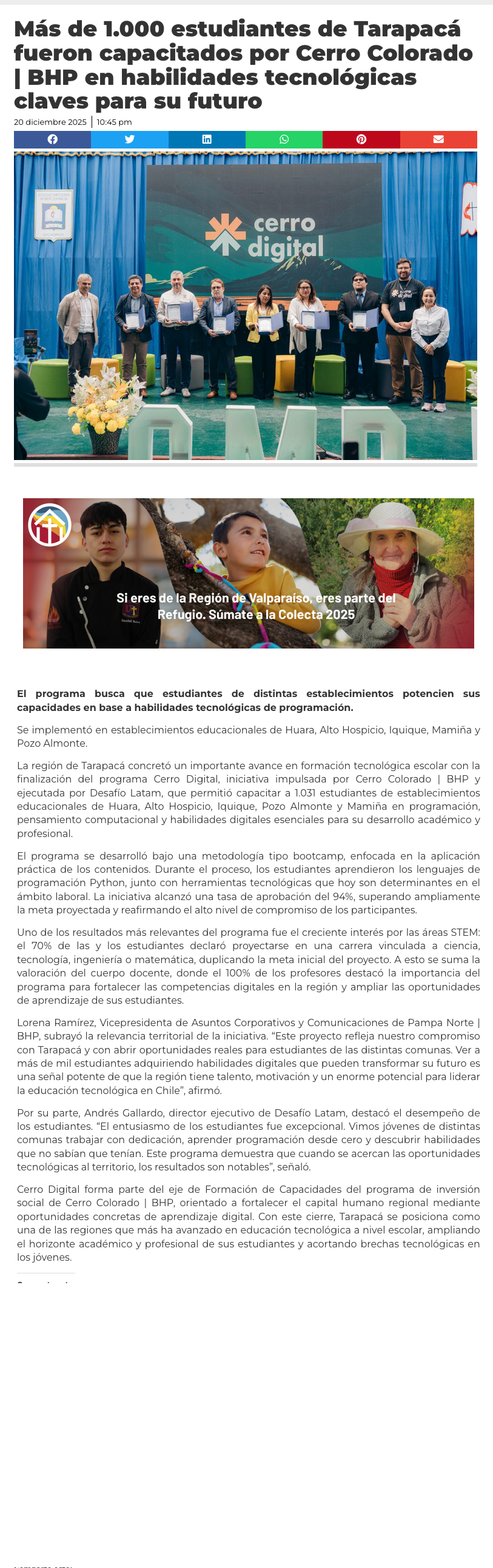 Más de 1.000 estudiantes de Tarapacá fueron capacitados por Cerro Colorado | BHP en habilidades tecnológicas - (reporteminero)
