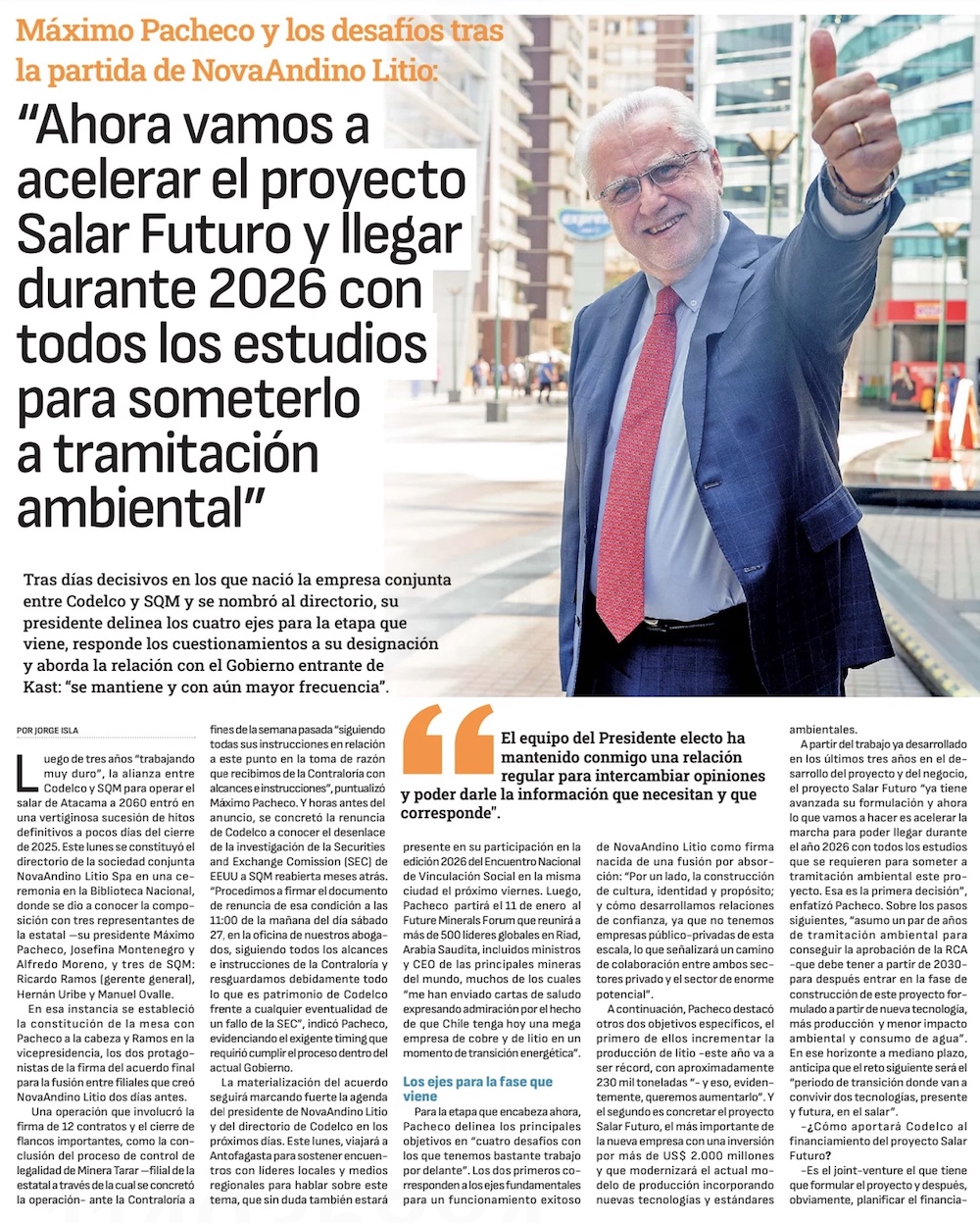 Máximo Pacheco y los desafíos tras la partida de NovaAndino Litio: “Ahora vamos a acelerar el proyecto Salar Futuro y llegar durante 2026 con todos los estudios para someterlo a tramitación ambiental” - (DF Online)