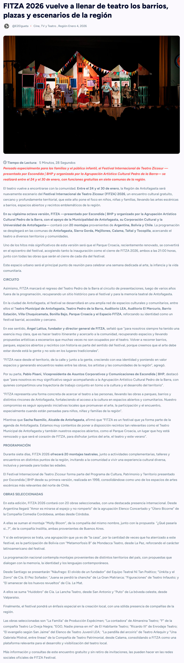 Del 24 al 30 de enero FITZA 2026 tomará seis comunas con festival de teatro gratuito - (elreferente.cl)