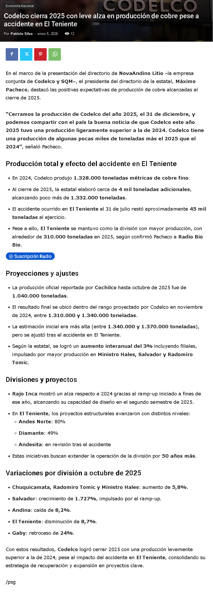 Codelco cerró 2025 con ligero aumento productivo: alcanzó las 1.332.000 toneladas de cobre - (La Tercera Online)