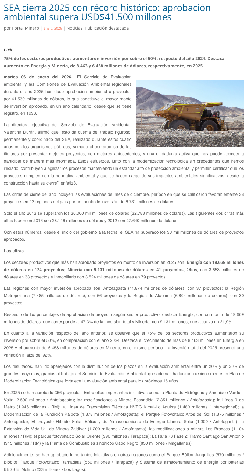 SEA cierra 2025 con récord histórico: Aprobación ambiental supera los US$41.500 millones - (mch.cl)