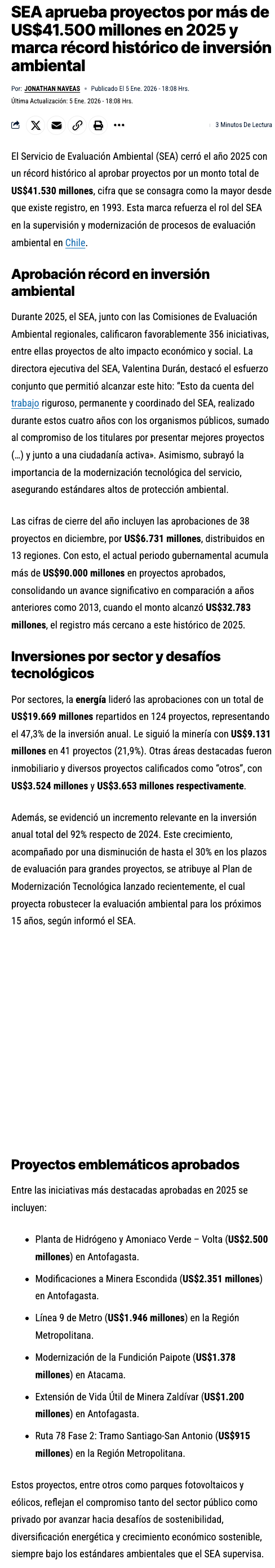 SEA cierra 2025 con récord histórico: Aprobación ambiental supera los US$41.500 millones - (mch.cl)