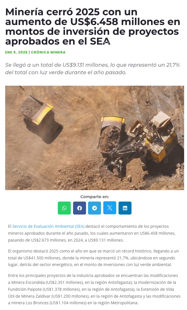 SEA cierra 2025 con récord histórico: aprobación ambiental supera USD$41.500 millones - (nuevaminería online)