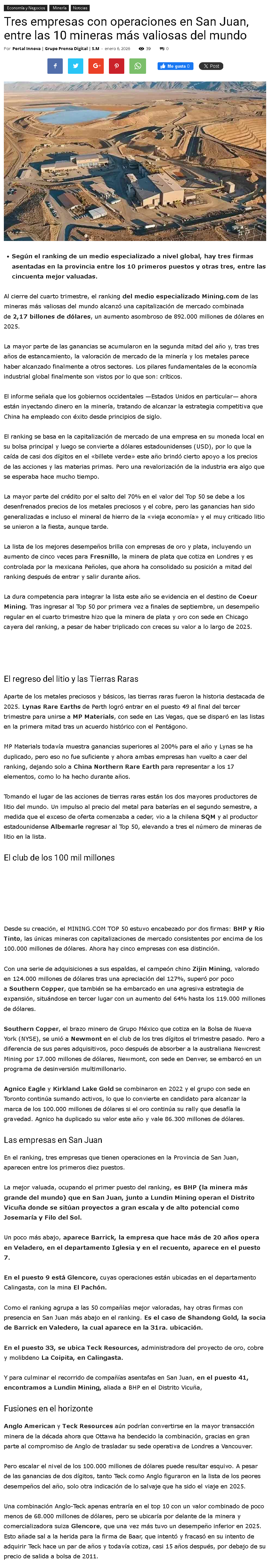 Siete de las 10 mineras más grandes del mundo tienen proyectos en Argentina - (dfsud.com)