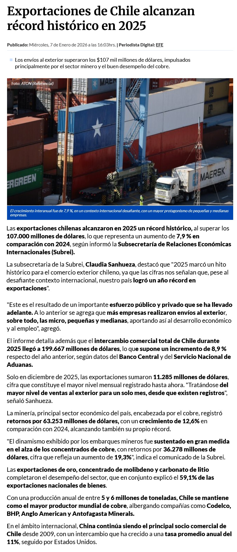 Hito histórico: exportaciones chilenas rompen récord en 2025 con más de 107.000 millones de dólares - (24horas.cl)