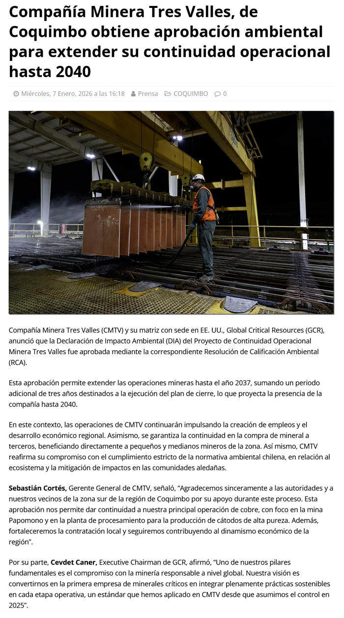Compañía Minera Tres Valles obtiene aprobación ambiental para extender su continuidad operacional hasta 2040 - (La Región)