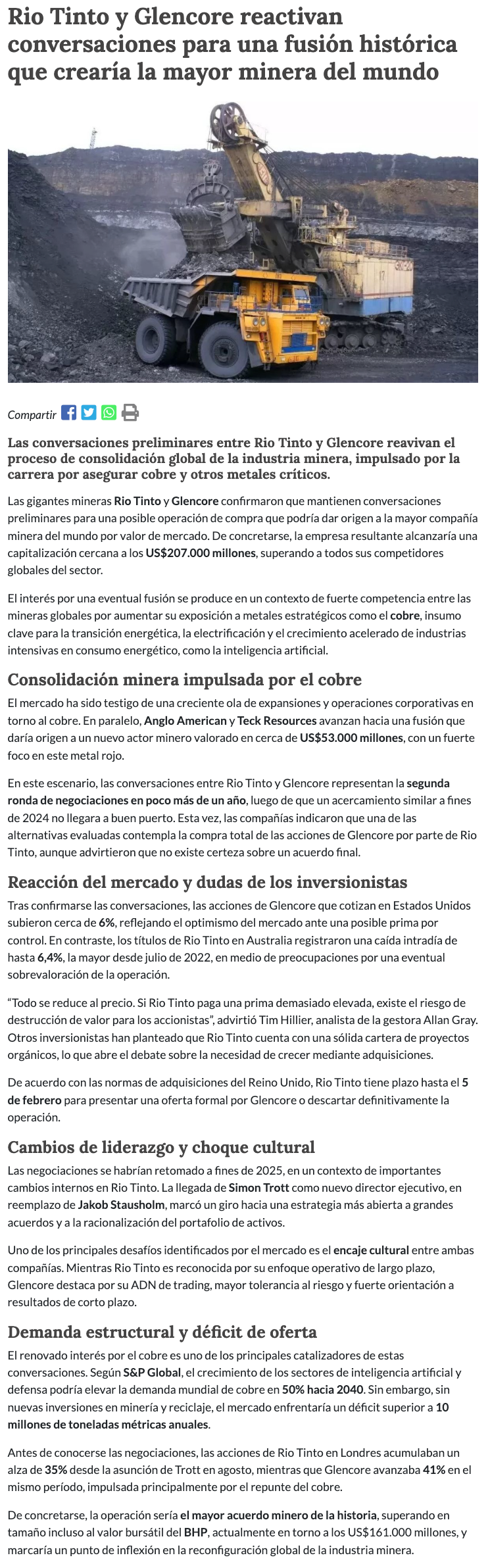Fusión Rio Tinto–Glencore por US$260.000 millones: el plazo del 5 de febrero y el rol clave de Argentina en litio y cobre - (redimin)