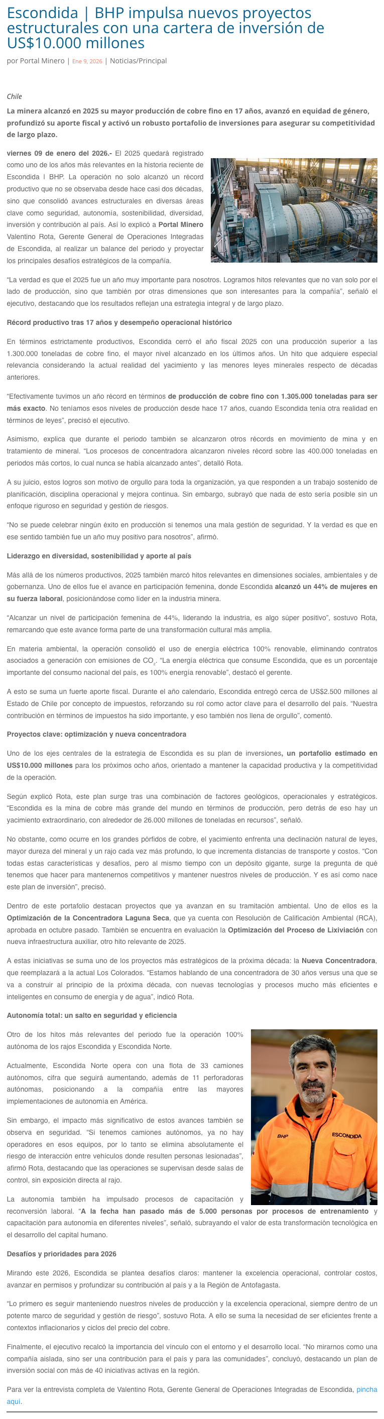 Escondida | BHP impulsa nuevos proyectos estructurales con una cartera de inversión de US$10.000 millones - (elreporterodeiquique)