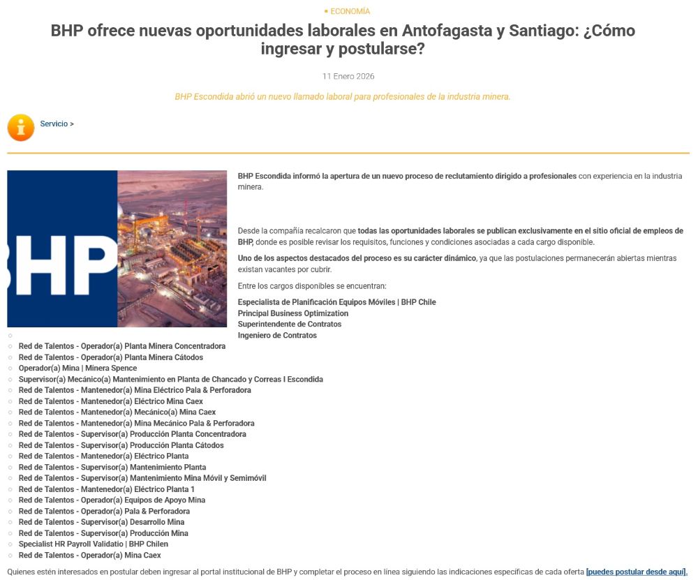 Nueva y masivas ofertas de empleo en BHP Escondida: Hay más de 30 cargos disponibles en sus faenas y casa matriz - (elnortero)