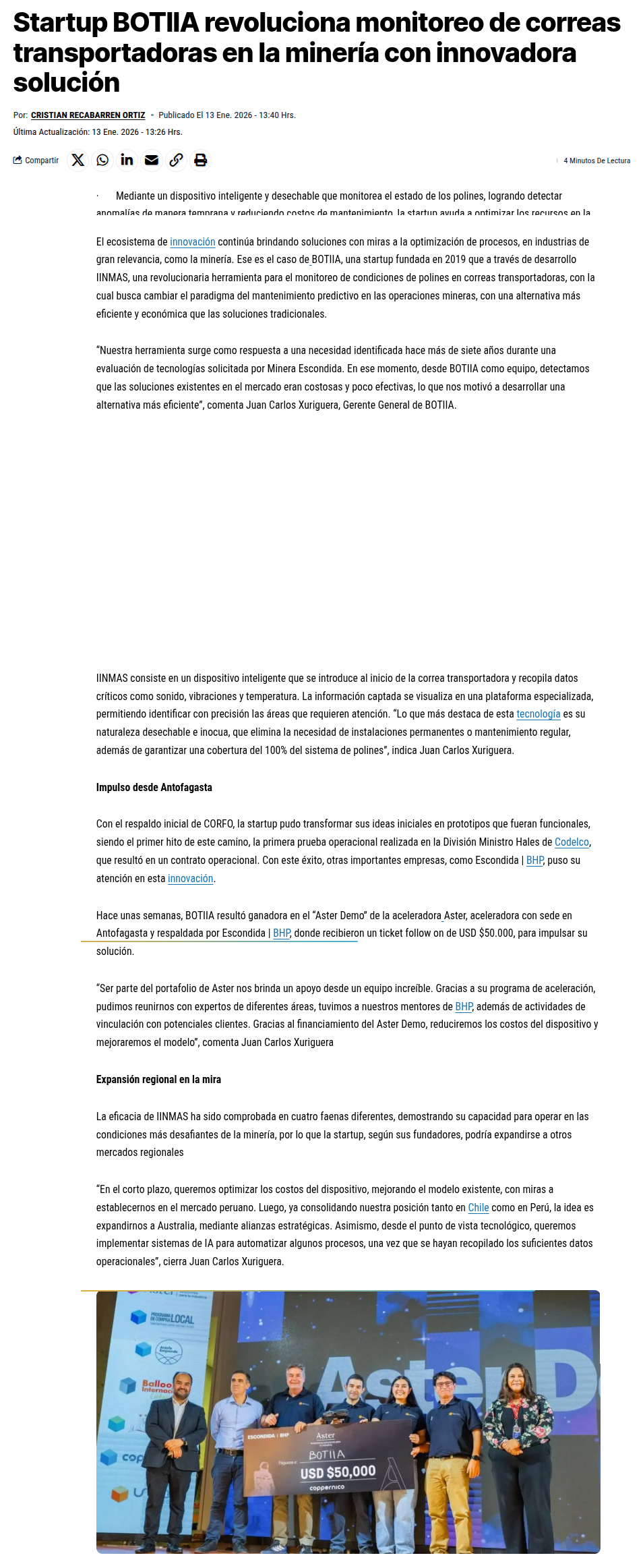 Startup BOTIIA revoluciona monitoreo de correas transportadoras en la minería con innovadora solución - (portalinnova.cl)