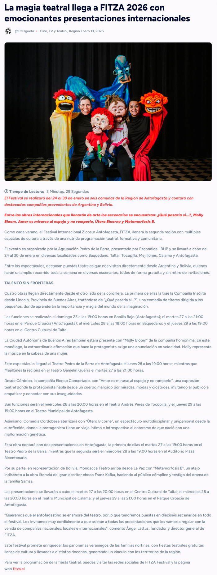 La magia del teatro vuelve a FITZA 2026 con montajes internacionales de primer nivel - (soyantofagasta)