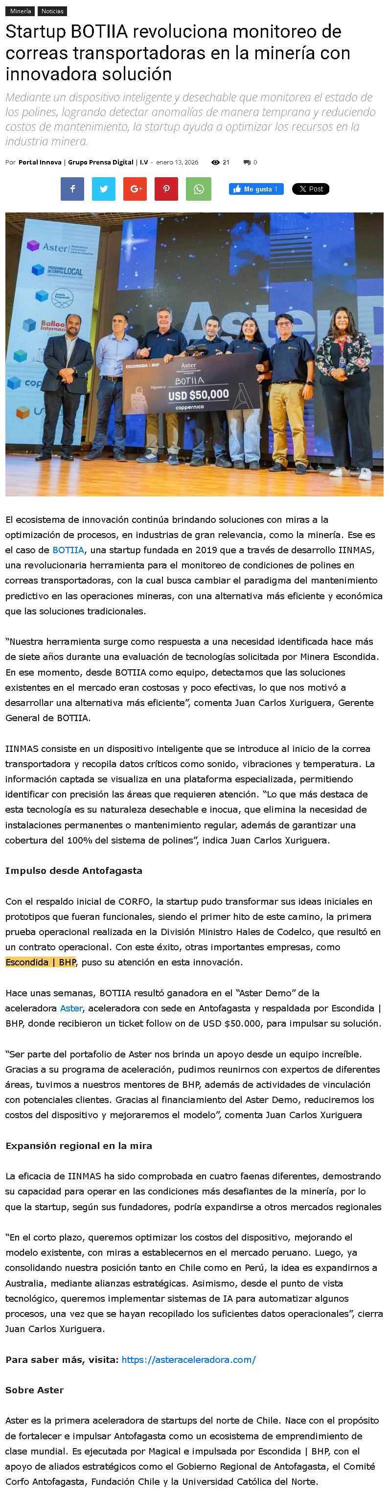 Startup BOTIIA revoluciona monitoreo de correas transportadoras en la minería con innovadora solución - (Estrategia)
