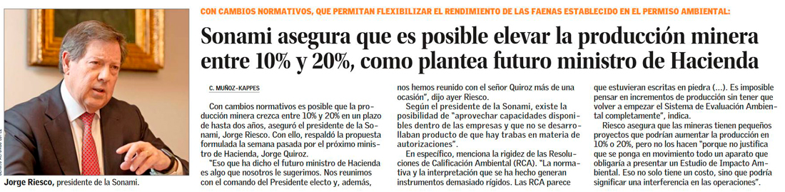 Sonami se alinea con Quiroz y dice que se puede elevar en 10% producción de cobre solo con cambios normativos - (Diario Financiero)