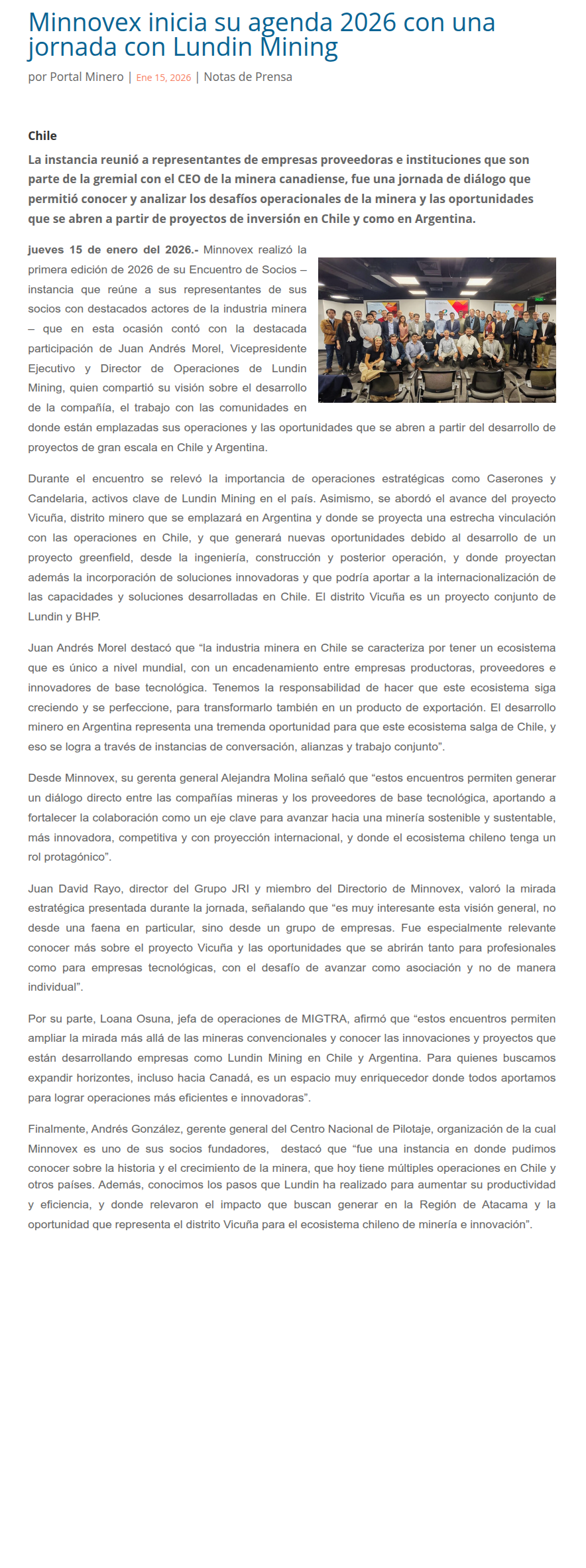 Minnovex abre 2026 con Lundin y foco en Distrito Vicuña - (norteonline.cl)