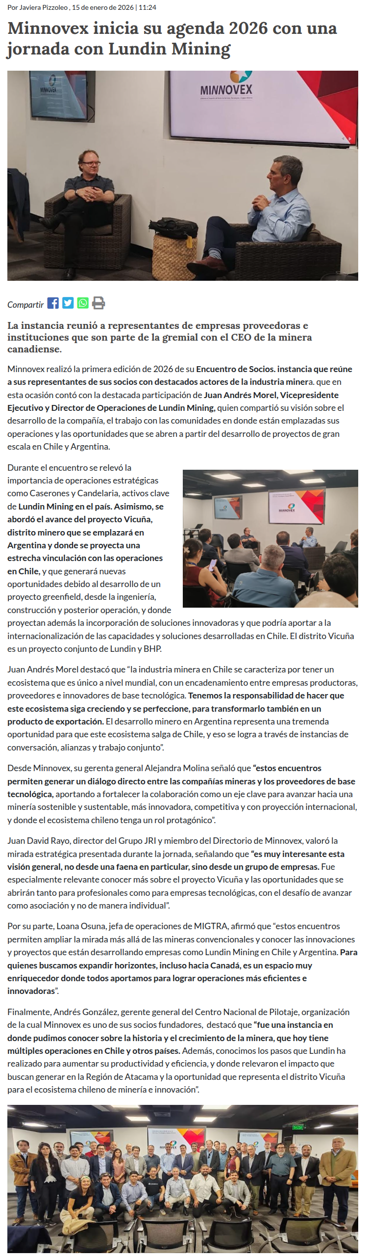 Minnovex abre 2026 con Lundin y foco en Distrito Vicuña - (norteonline.cl)