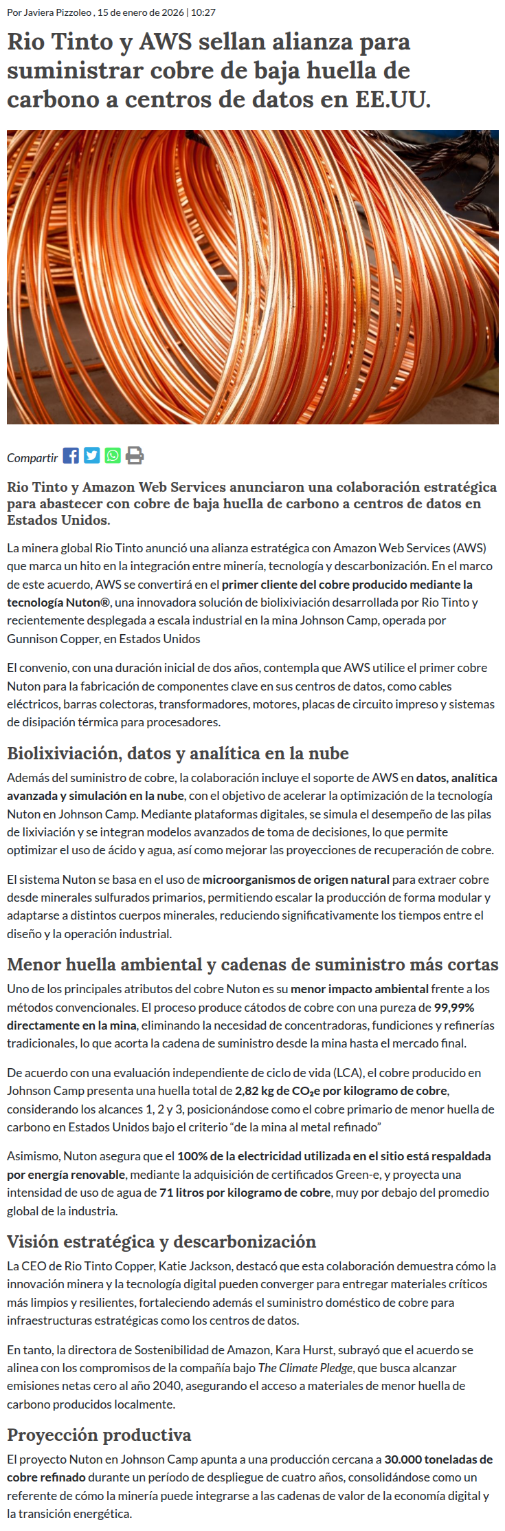 Amazon Web Services apuesta por el cobre estadounidense en alianza con Rio Tinto - (Pulso)