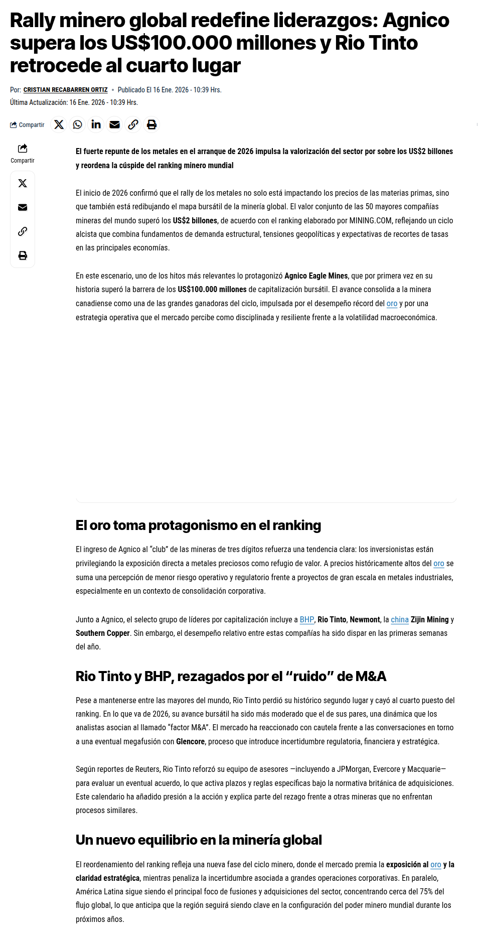 Reordenamiento en la élite minera: Rio Tinto cede terreno y el oro redefine el liderazgo global - (redimin)