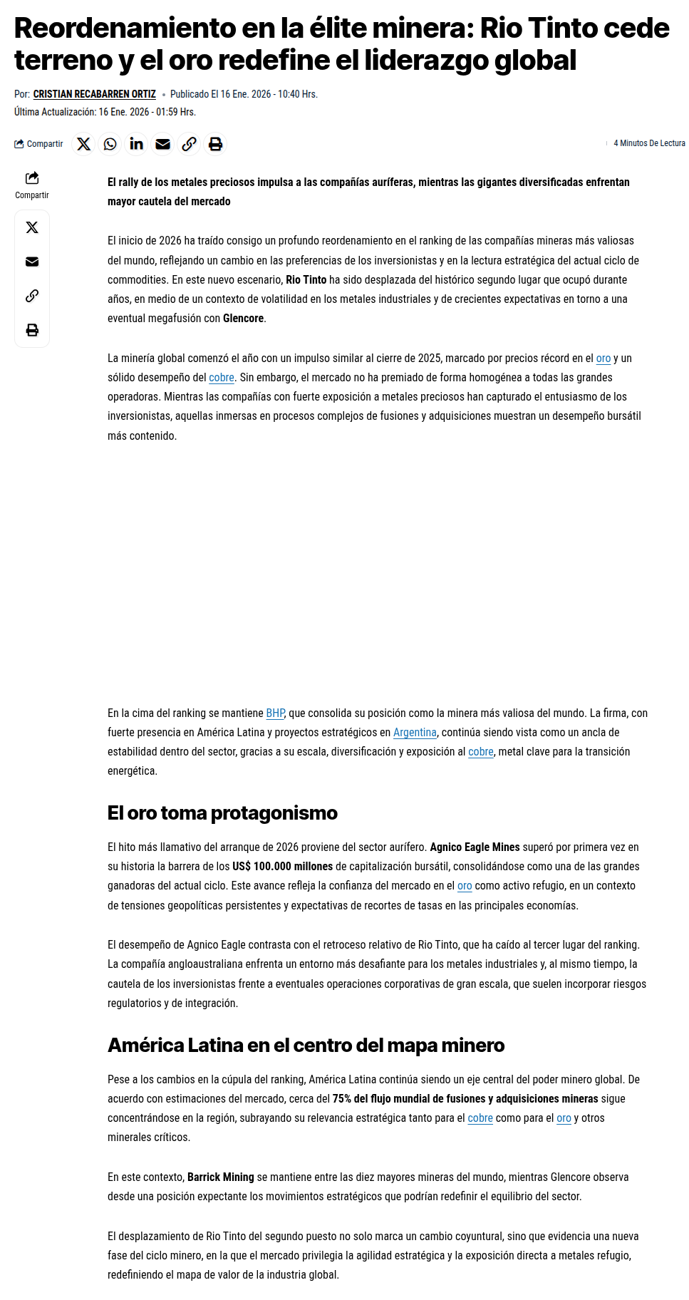 Rally minero global redefine liderazgos: Agnico supera los US$100.000 millones y Rio Tinto retrocede al cuarto lugar - (redimin)