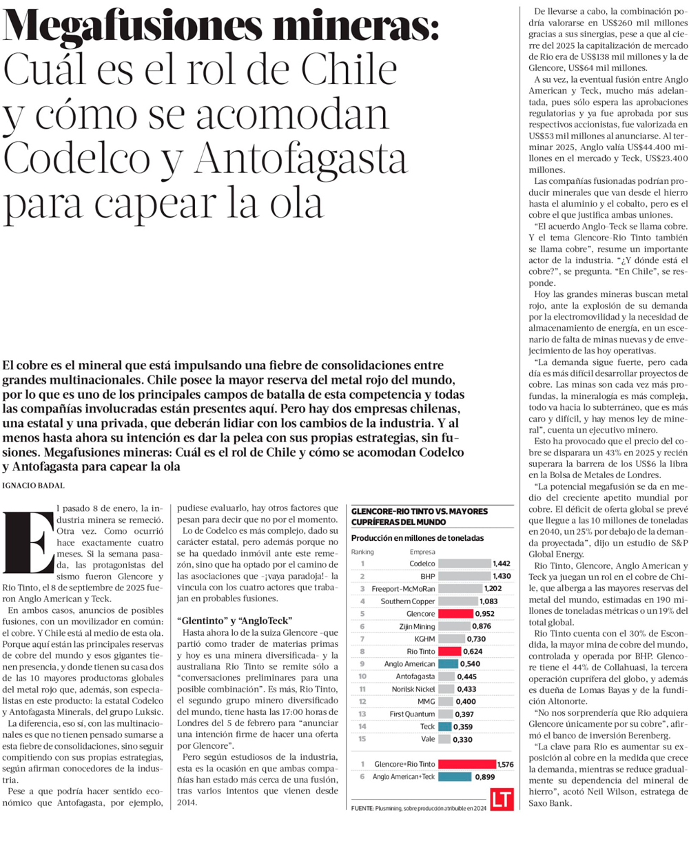 Megafusiones mineras: Cuál es el rol de Chile y cómo se acomodan Codelco y Antofagasta para capear la ola - (La Tercera Online)