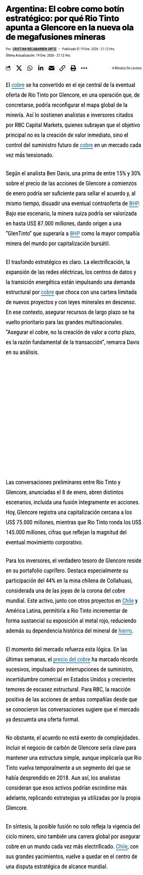 El cobre como botín estratégico: por qué Rio Tinto mira a Glencore en la nueva ola de megafusiones mineras - (reporteminero)
