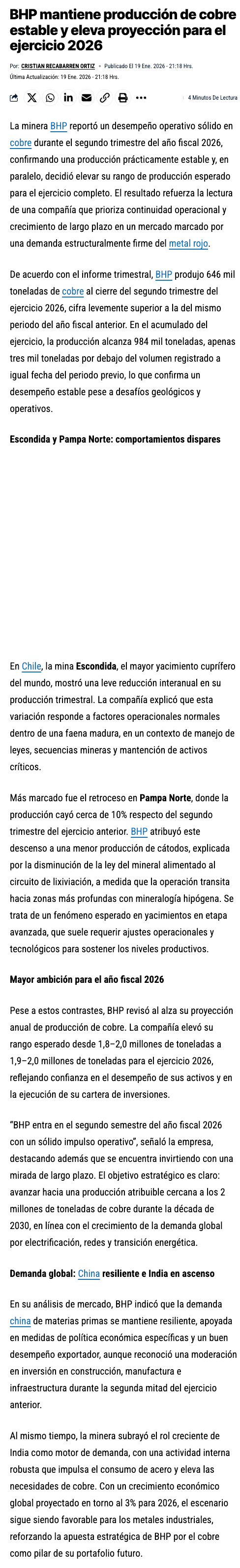 BHP reporta elaboración de cobre sostenida y aumenta rango de producción para el año fiscal 2026 - (La Tercera Online)