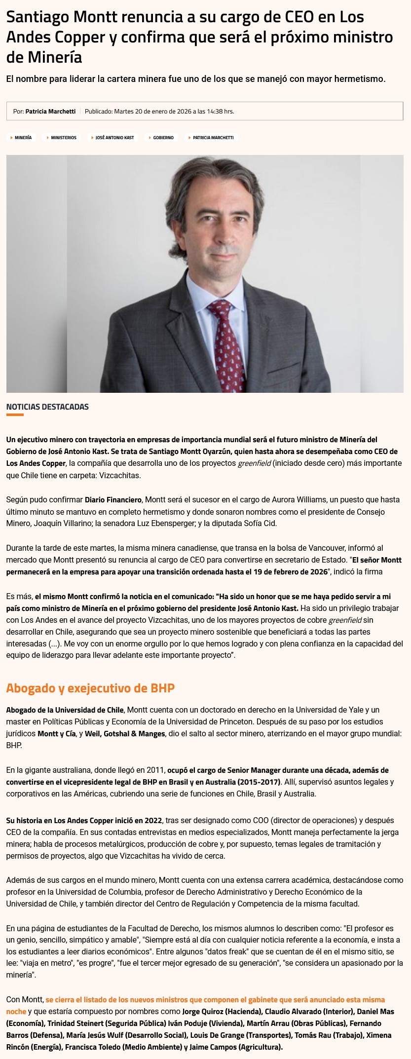 Anticipo de Andes Copper echa por tierra nombramiento del ministro de Minería - (El Diario de Atacama)