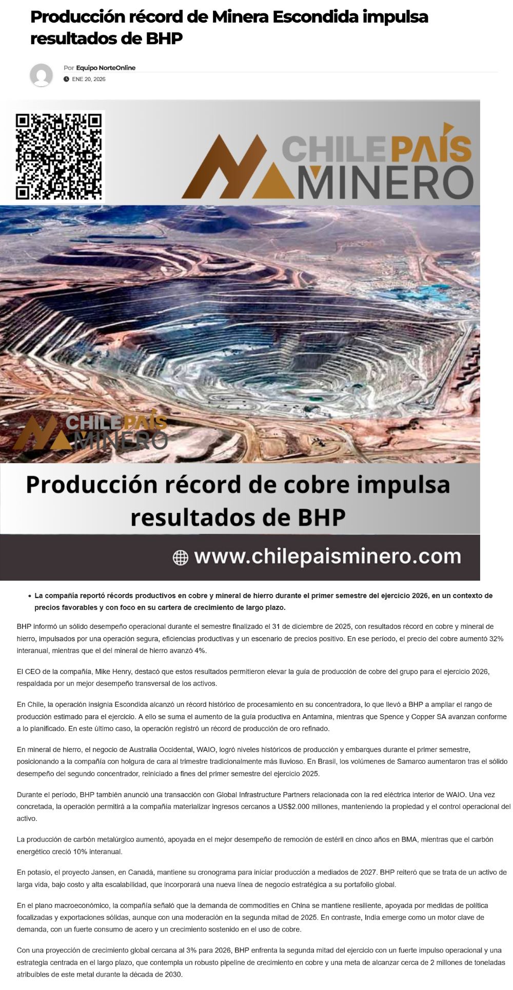 BHP impulsa producción de cobre y eleva su guía para el año fiscal 2026 - (nuevaminería online)