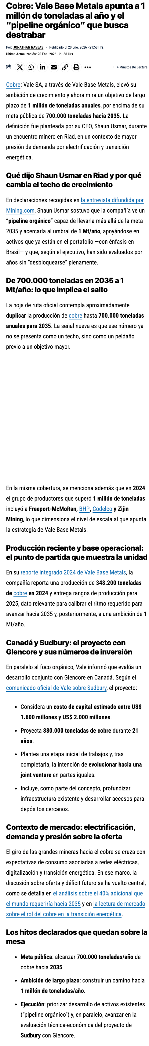Vale apunta a 1 millón de toneladas de cobre al año - (reporteminero)