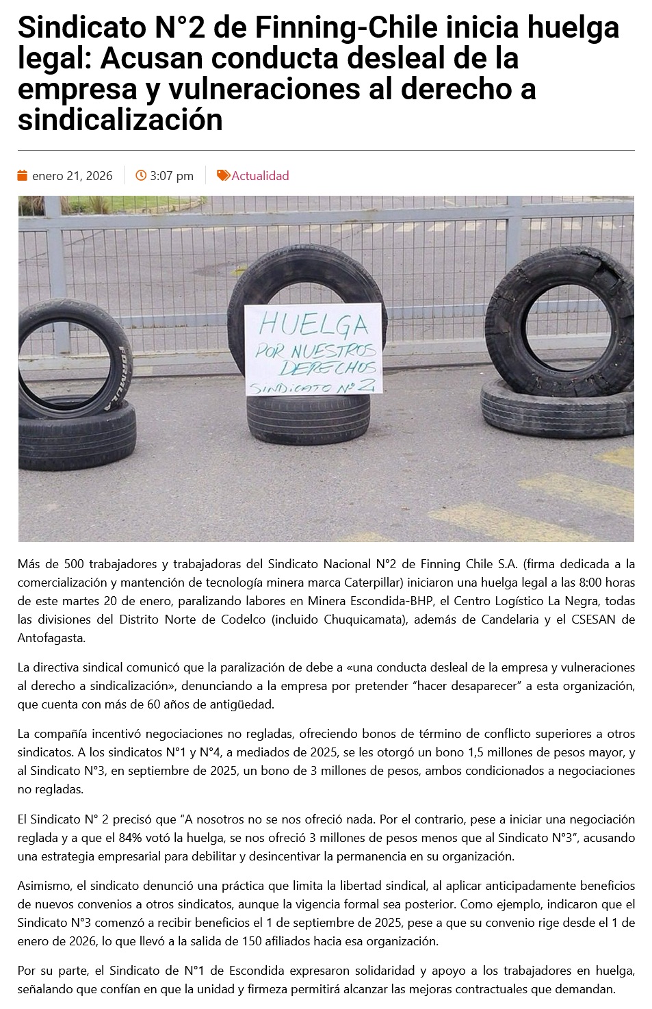 Sindicato N°2 de Finning inicia huelga legal tras no alcanzar acuerdo: paralización impacta servicios en BHP y Codelco - (reporteminero)