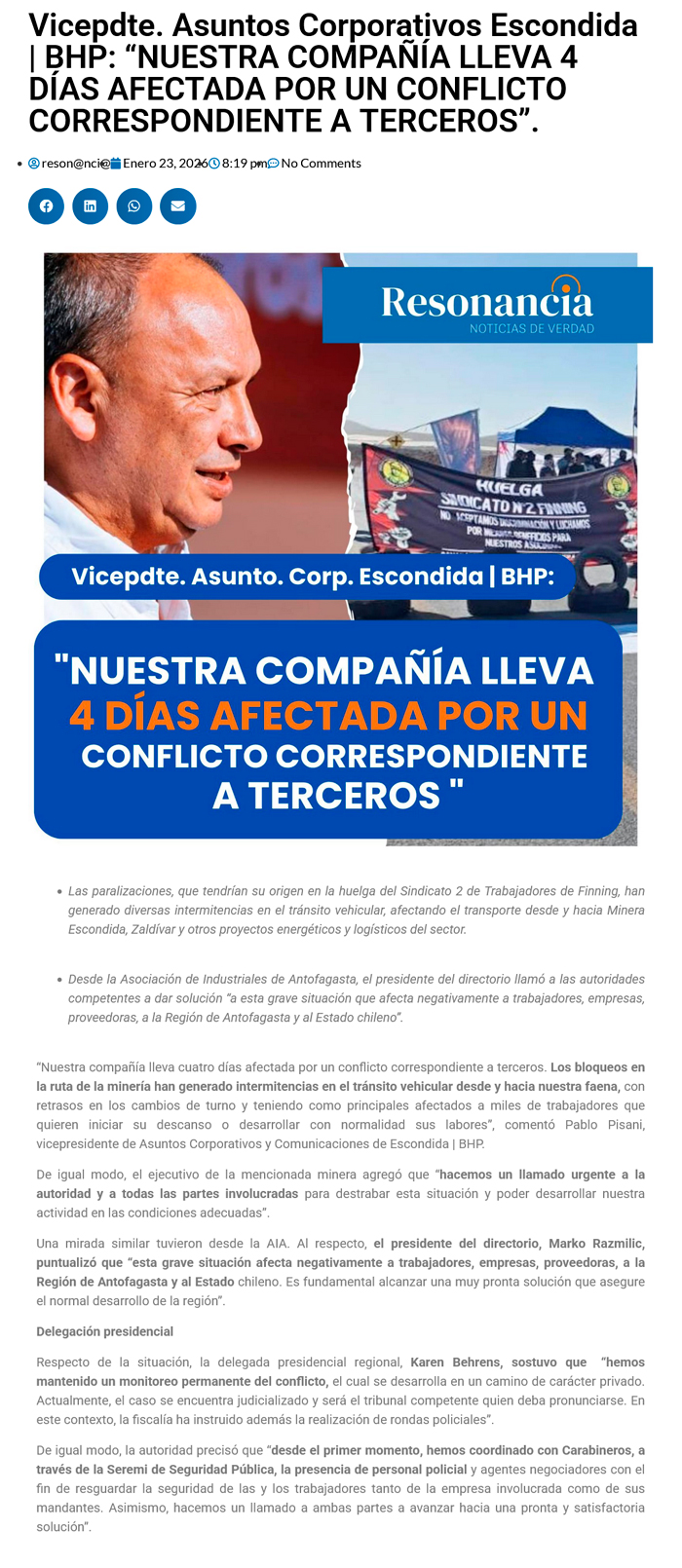 Escondida | BHP llama a la autoridad y a las partes involucradas a destrabar conflicto que mantiene bloqueos en rutas - (regionalista.cl)