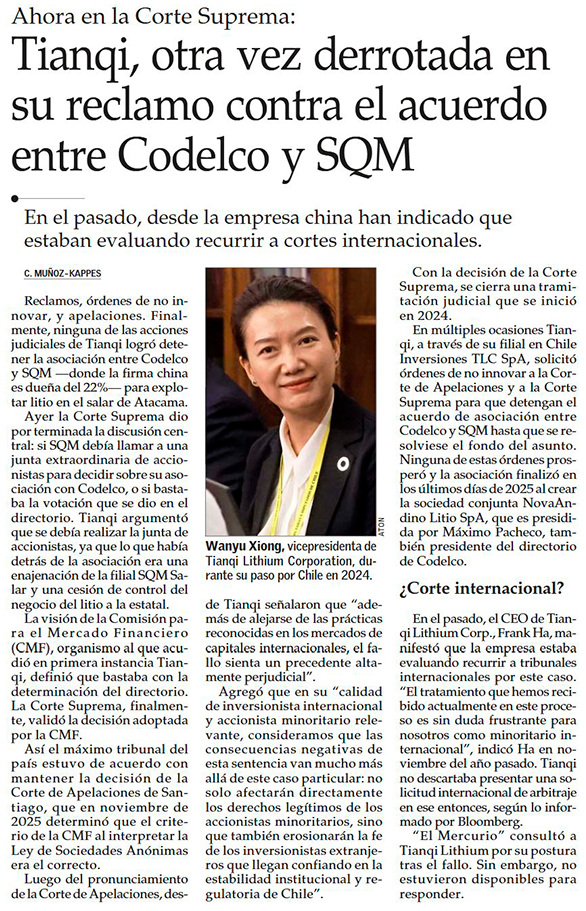 Suprema rechaza recurso de Tianqi y consolida alianza Codelco-SQM - (La Segunda)