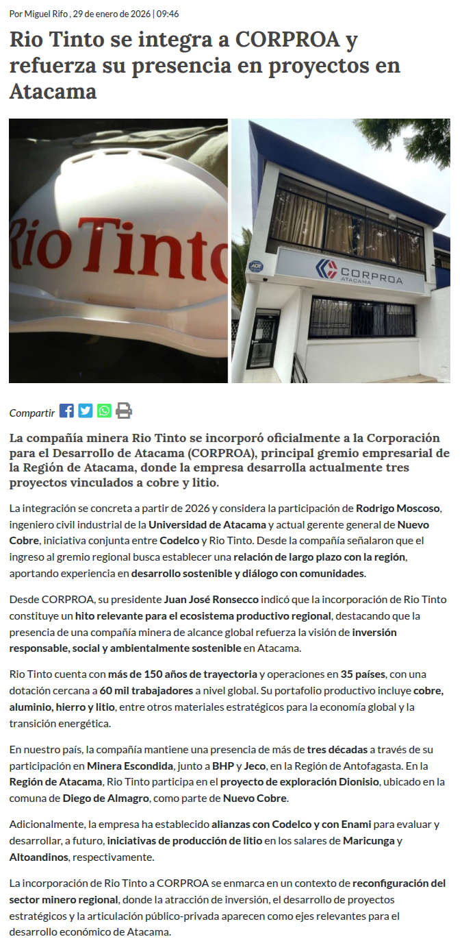 Minera Rio Tinto se integra a CORPROA para contribuir al desarrollo sostenible de la Región de Atacama - (elreporterodeiquique)